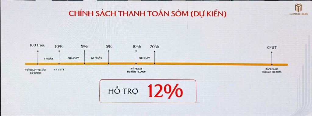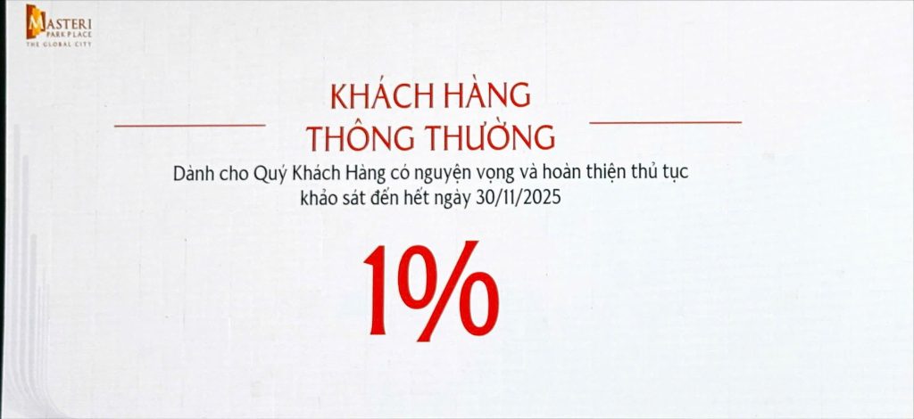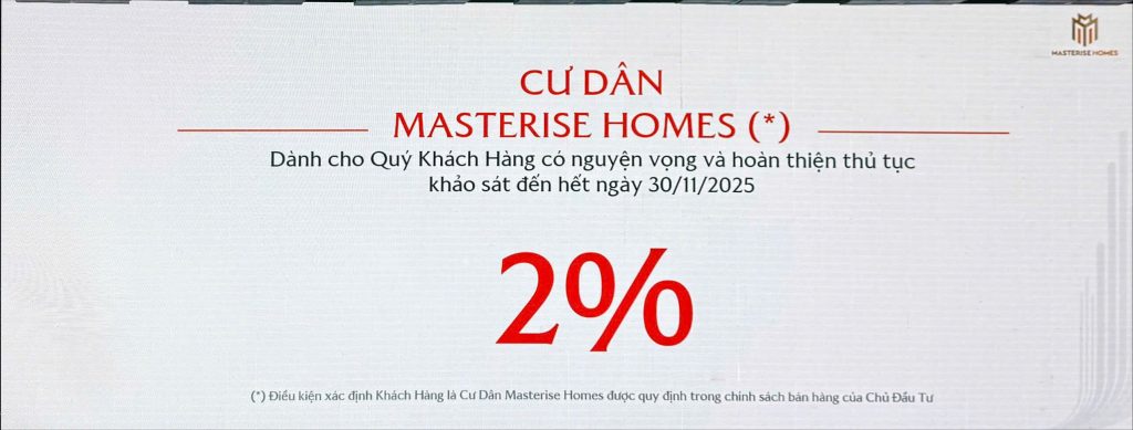 - Ưu đãi 2% đặc quyền cho cư dân Masterise Homes, áp dụng đến ngày 30/11/2025.