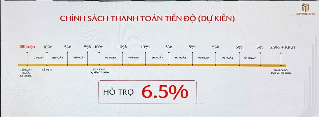 Thanh toán chia thành 8–10 đợt, mỗi đợt tương ứng với tiến độ xây dựng.