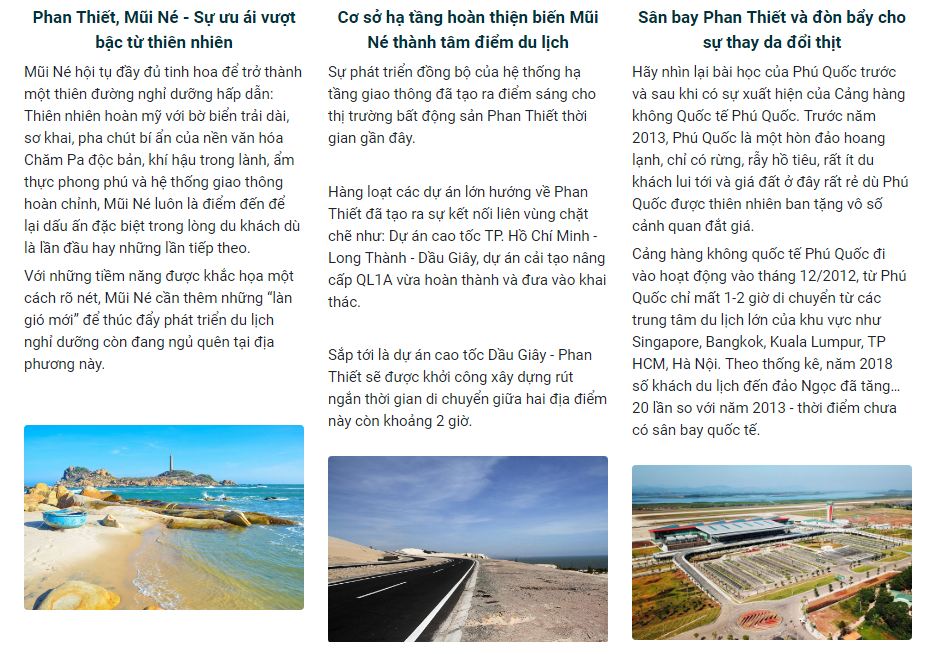 Phan Thiết, Mũi Né với vị trí địa lý thuận lợi, cảnh quan thiên nhiên mỹ mãn cùng cơ sở hạ tầng ngày càng được đầu tư mở rộng,… Mũi Né đang trở thành điểm đến lý tưởng cho du khách trong và ngoài nước thời gian gần đây. Sở hữu những ưu thế vượt trội để phát triển du lịch, tuy nhiên, Mũi Né – Bình Thuận vẫn chưa thực sự phát huy được hết tiềm năng vốn có, vẫn đặc biệt “thèm khát” những dự án bất động sản nghỉ dưỡng có tầm
