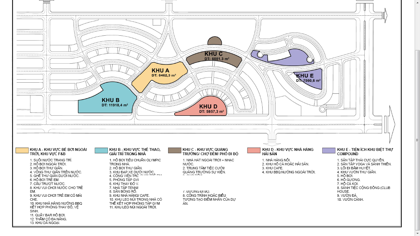 – Khu vực thể thao, giải trí trong nhà – Khu B: Hồ bơi cảnh quan thư giãn, phòng tập gym, spa, nhà tập tennis, sân bóng rổ, khu nhà hàng/café, công viên trò chơi trẻ em và các hoạt động mới lạ như khu đạp xe dưới nước, khu leo núi trong và ngoài nhà,… với quy mô phục vụ lớn, trang thiết bị tân tiến nhất.